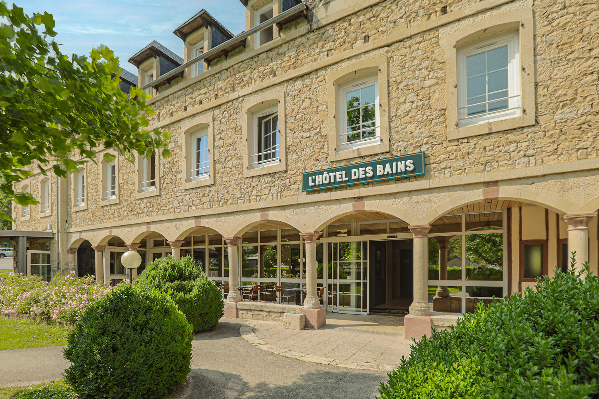 Plus d'infos >Entre Conques et Rodez, sur la commune de Salles-la-Source, le domaine de 2 hectares de L’Hôtel des Bains allie le charme des vieilles pierres à la nature verdoyante du Vallon de Marcillac.