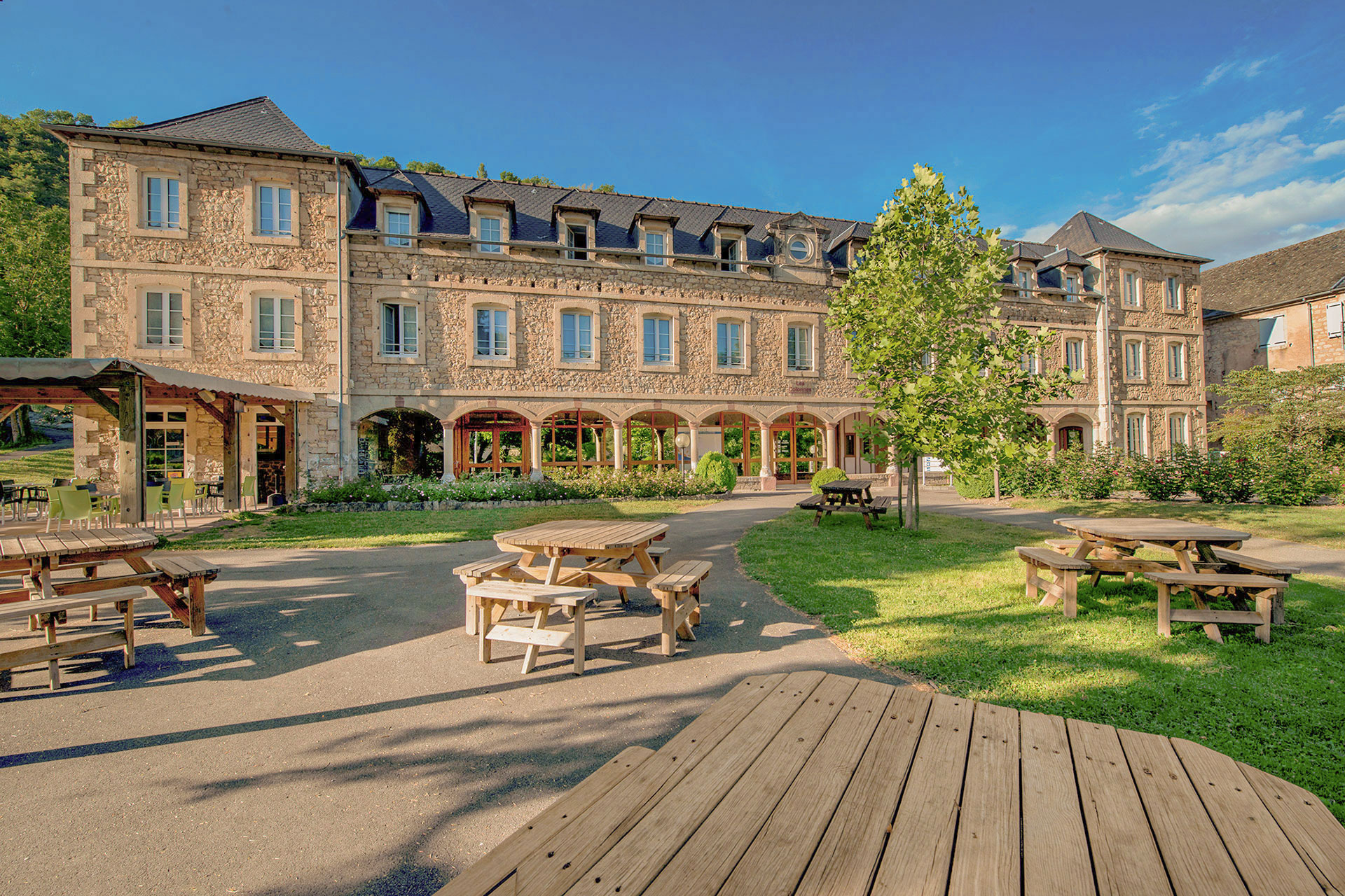 Between Conques and Rodez, in the town of Salles-la-Source, the 2-hectare estate of L’Hôtel des Bains combines the charm of old stones with the green nature of Marcillac’s Vallon.
